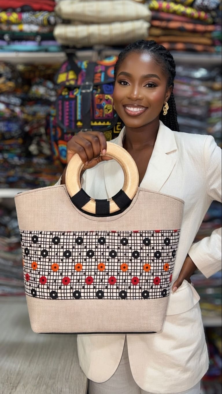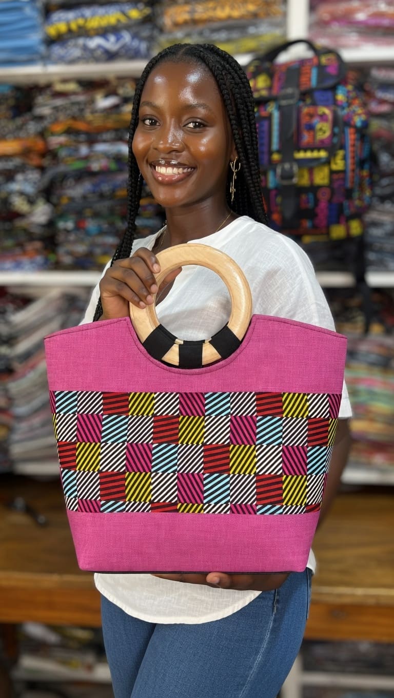 Conception rigide : le sac conserve sa forme même posé, garantissant une protection fiable du contenu et une tenue impeccable. La structure permet aussi une lecture nette du motif wax et met en valeur la poignée en bois.